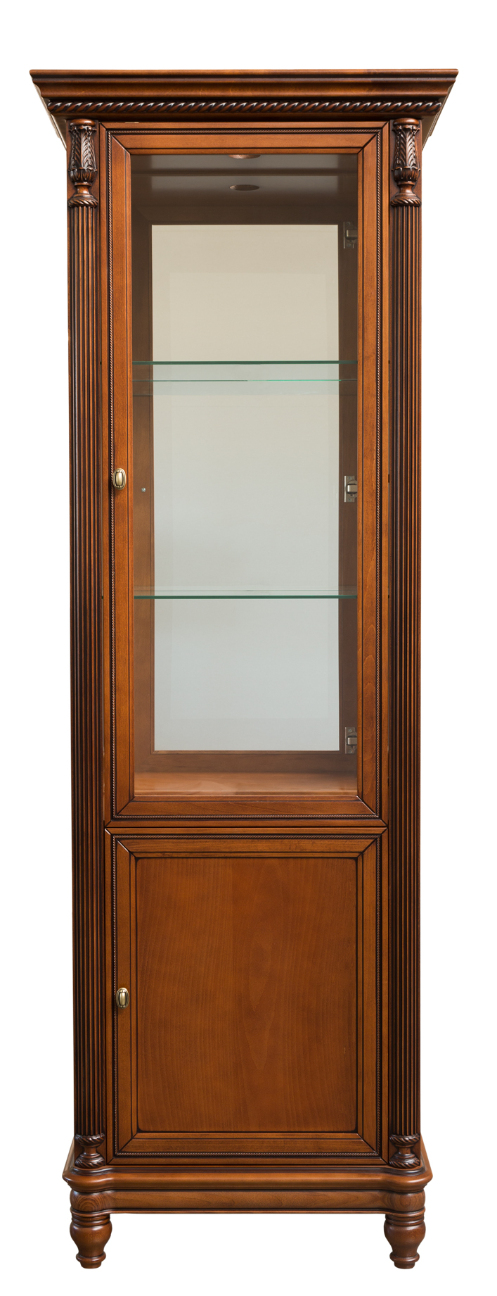 Витрина оснащена верхней внутренней подсветкой (подсветкой не оснащаются витрины с деревянными полками и деревянной задней панелью).